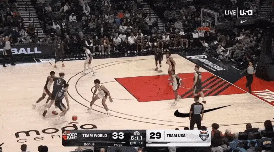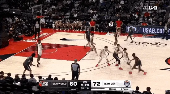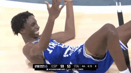 在空切和突破方面,萨尔也做的差强人意。他没有娴熟的运球,在U18里经常出现运球加速到一半被打断,夹击打乱节奏导致护球不稳定的问题。然而,在面对closeout时,萨尔则展现了自身强悍的一面,虽然身材偏瘦,但爆发力与敏捷弥补了这一不足。他的运球不够稳定,在欧洲顶级联赛面对经验丰富球员或是在U18面临同年龄段顶尖防守人时,常陷入摆脱不了对手或者被压迫丢球的困境里。由于缺乏力量,萨尔在强突时容易受阻,在对抗中易失衡,更依靠速度而非身体对抗。不过在杜克,他有着布泽尔吸引火力,作为一个接应手显然会得到更好的突破环境。而萨尔也慢慢磨砺了一定的抛投技巧,可以在行进间倚人利用臂展去出手。更遑论他在终结的时候会在条件允许的情况下尽可能扣篮得分,特别是在转换进攻的时候。而除持球突破外,萨尔在阵地战中还能通过空切冲击篮筐,他对空切的嗅觉显著高于杜克的其他高中生,且善于结合跑动和停滞来找到空档。而在油漆区内,他也可以利用臂展在各个角度完成出手。依托于优秀的敏捷性和弹跳,萨尔虽说体格瘦弱却依旧可以强硬终结。现阶段,萨尔尚未展现持球撕裂防守的能力,非纯得分手或微波炉型球员。