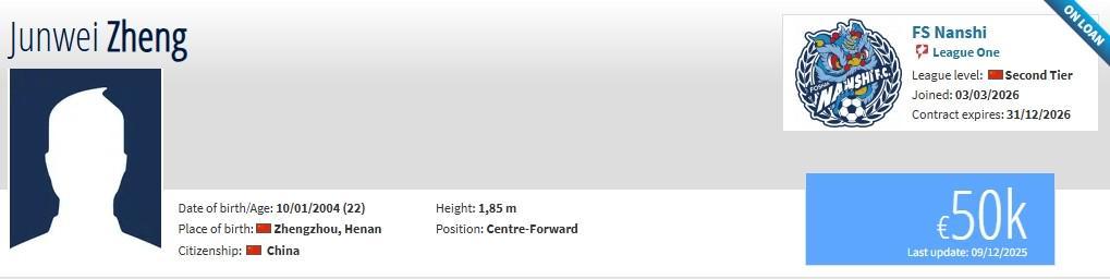 北京时间3月4日,德转更新,佛山南狮续租河南队前锋郑钧蔚,租借深圳新鹏城门将葛一凡。